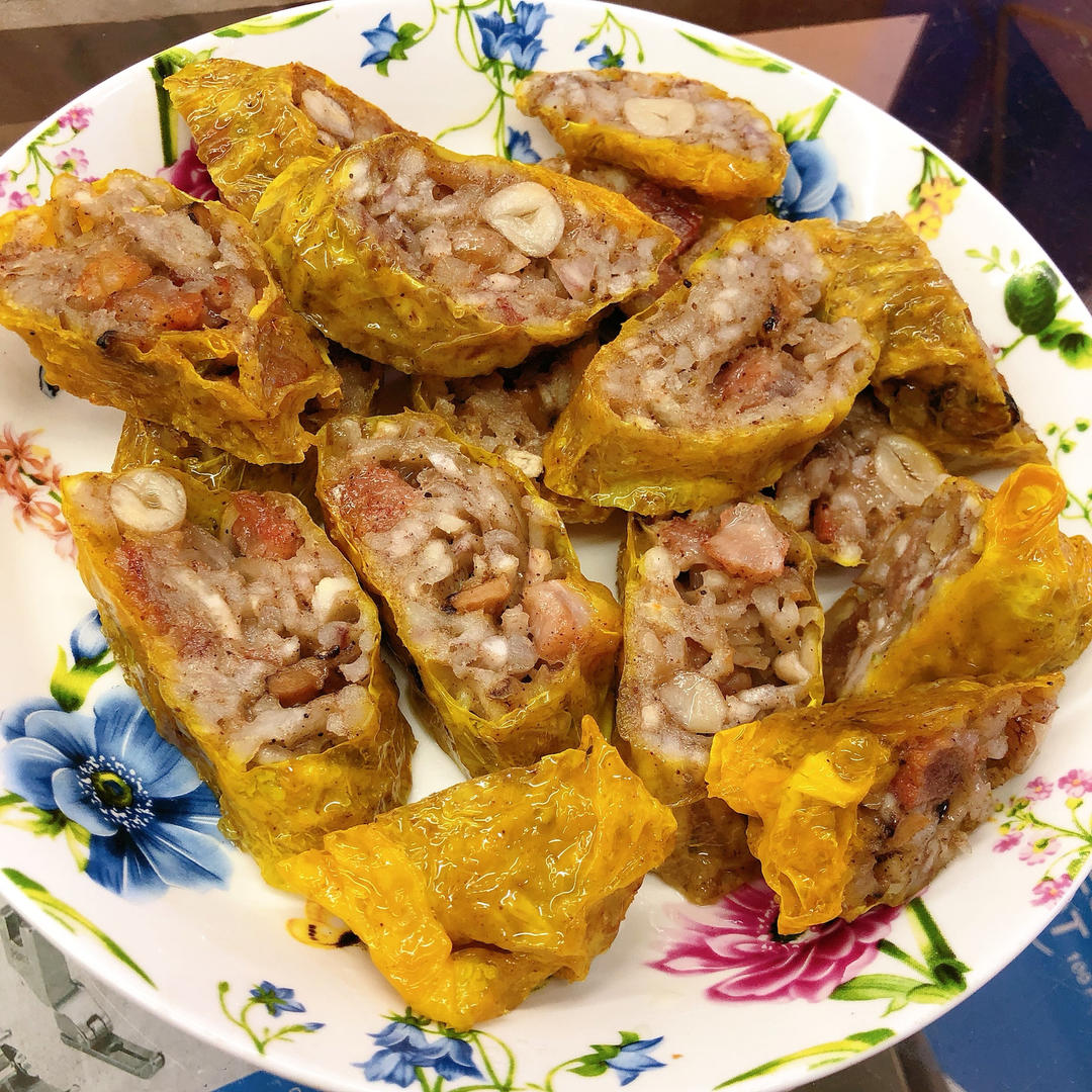 腐皮边上和两头沾些面糊,这样才粘住。