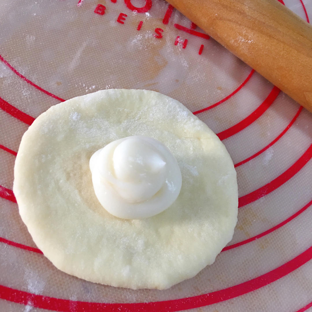 用擀面杖将面团擀成圆形⭕️挤上酸奶酱(一点就好,千万不要挤太多,太多烤时会爆浆出来,盖子和模具粘在在一起,超级难打开,我试过这样子)😅