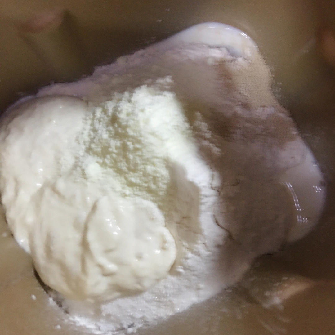 发酵好的波兰种和主面团所有材料(除黄油外)放入面包机和成面团。
