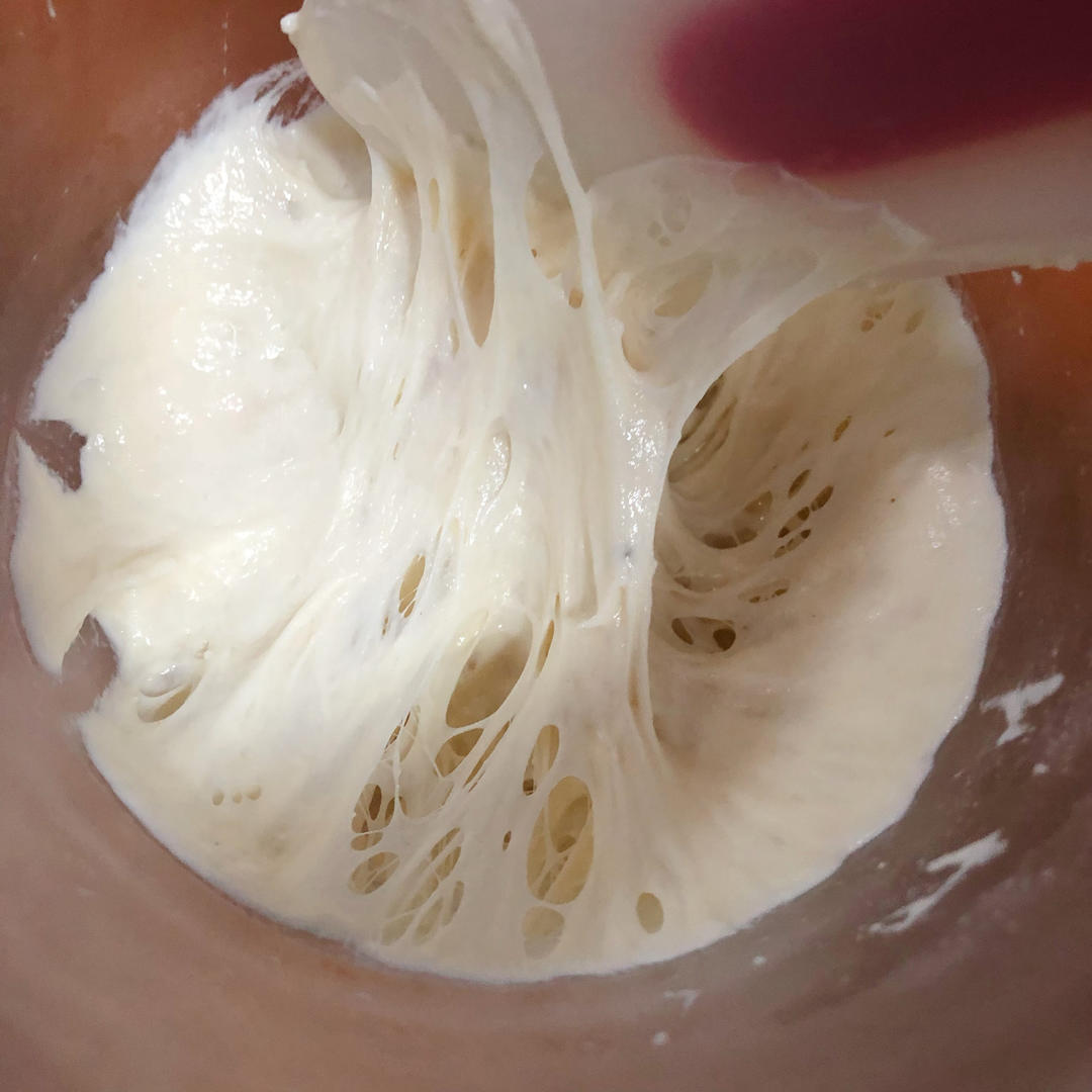 波兰种所有材料混合搅拌均匀,盖上保鲜膜发酵。表面出现气泡,内部呈丰富的蜂窝状时,即可使用。
