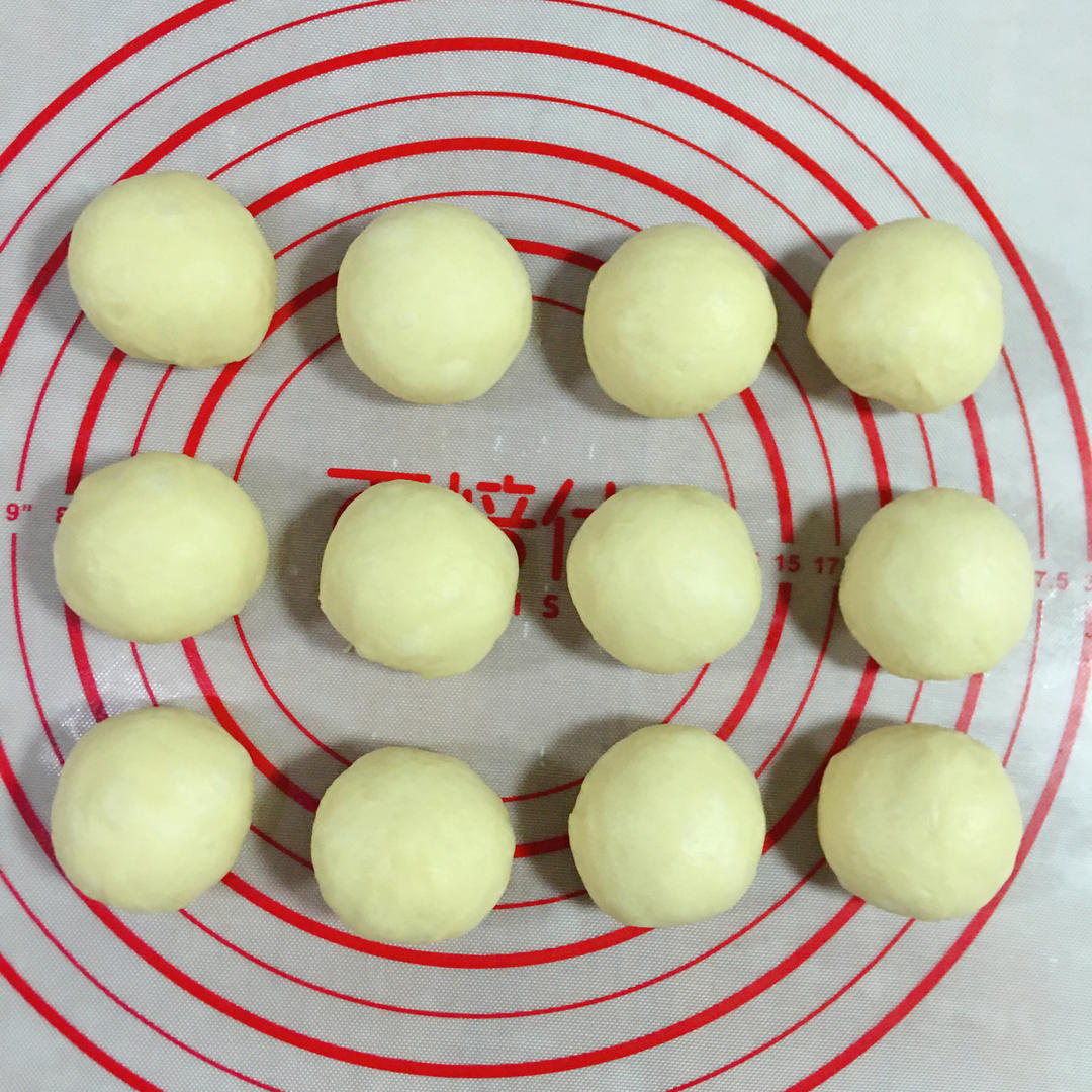 面团发酵完成,按压排气。 将面团平均分成12份,整圆,盖上盖子发酵20分钟。