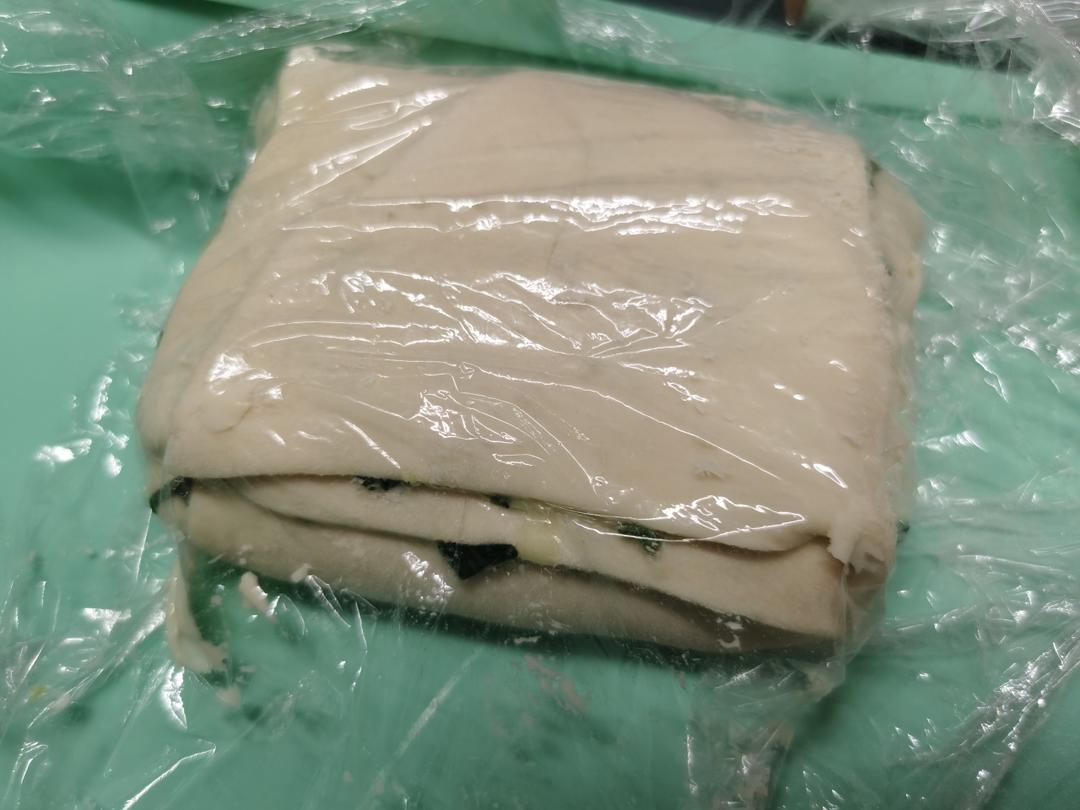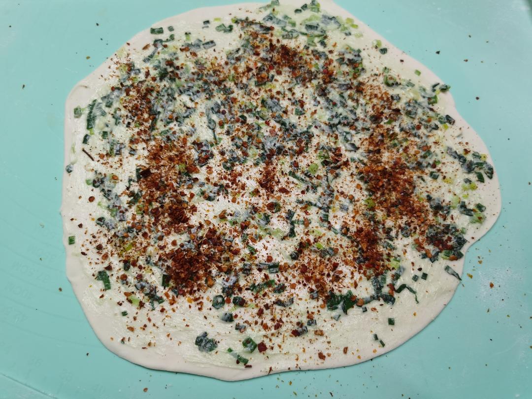 醒发好的面团分成5个面团(不做的还是用保鲜膜包好,防止表面发干),取一个面团揉圆擀成薄的饼皮,均匀地刷上馅料(用两个勺子🥄,方便取也方便推均),擀面团切记要用干粉,不然擀好就贴在硅胶垫上不好取;