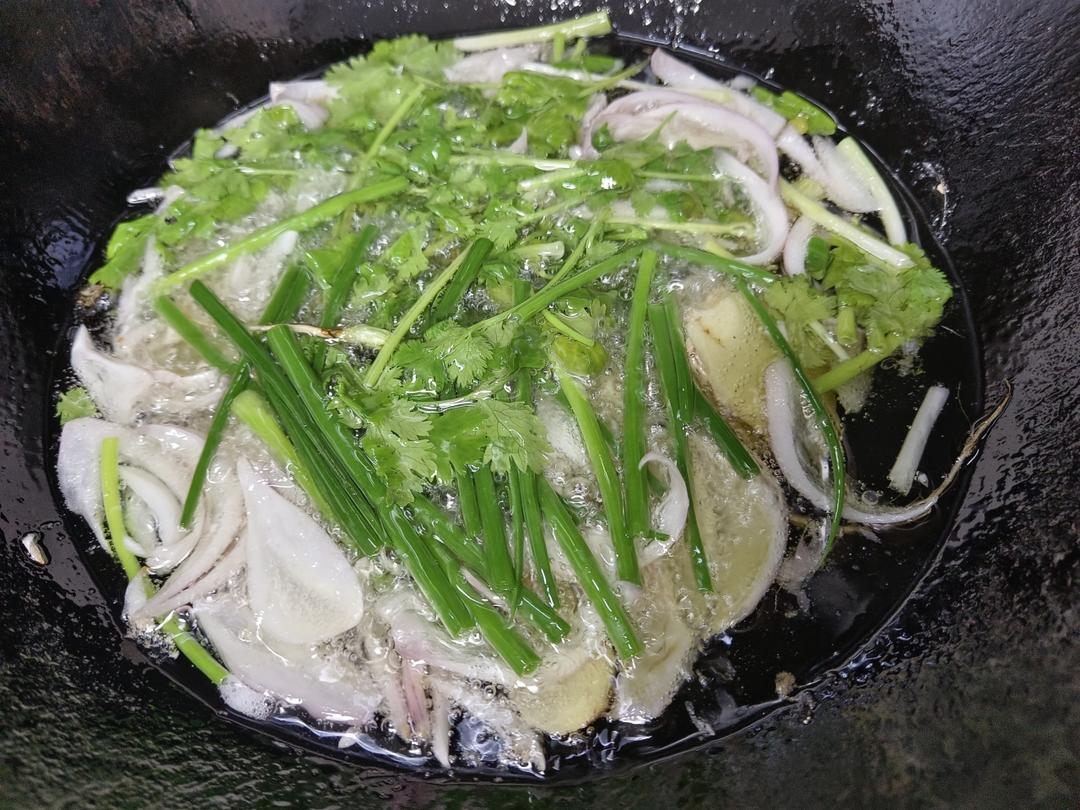 把油倒入锅里,先下姜片、香菜根、葱白和洋葱,小火慢炸