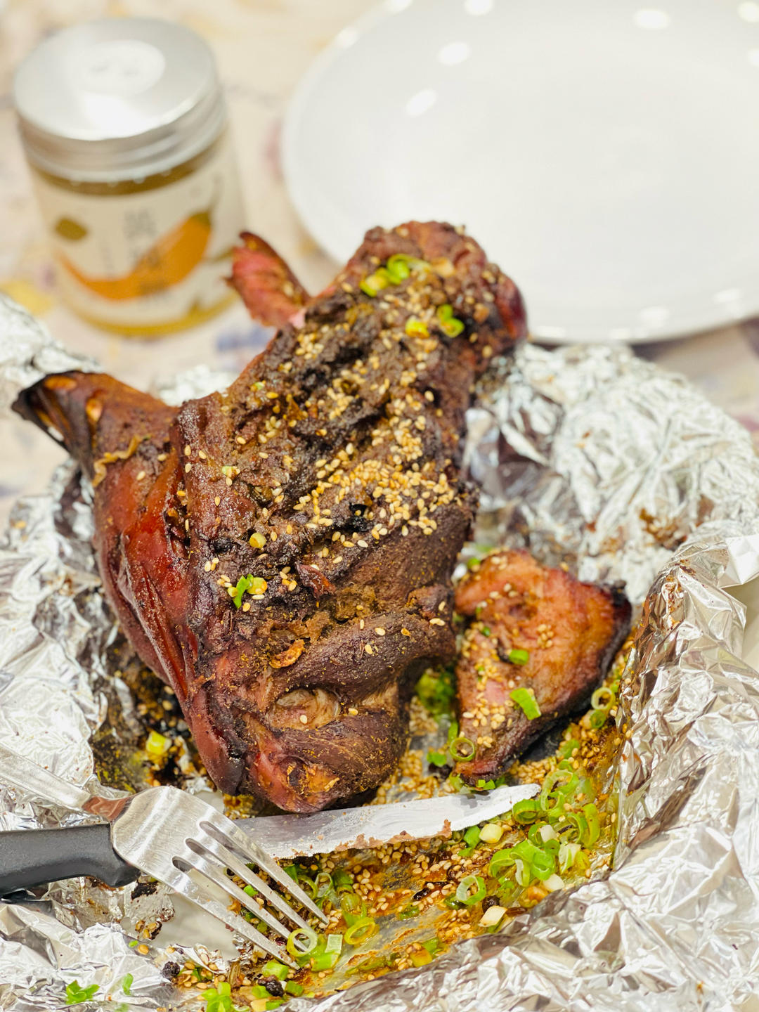 第二天取出放至常温状态,锡纸刷满清油,包裹羊腿,395华氏度烤90分钟