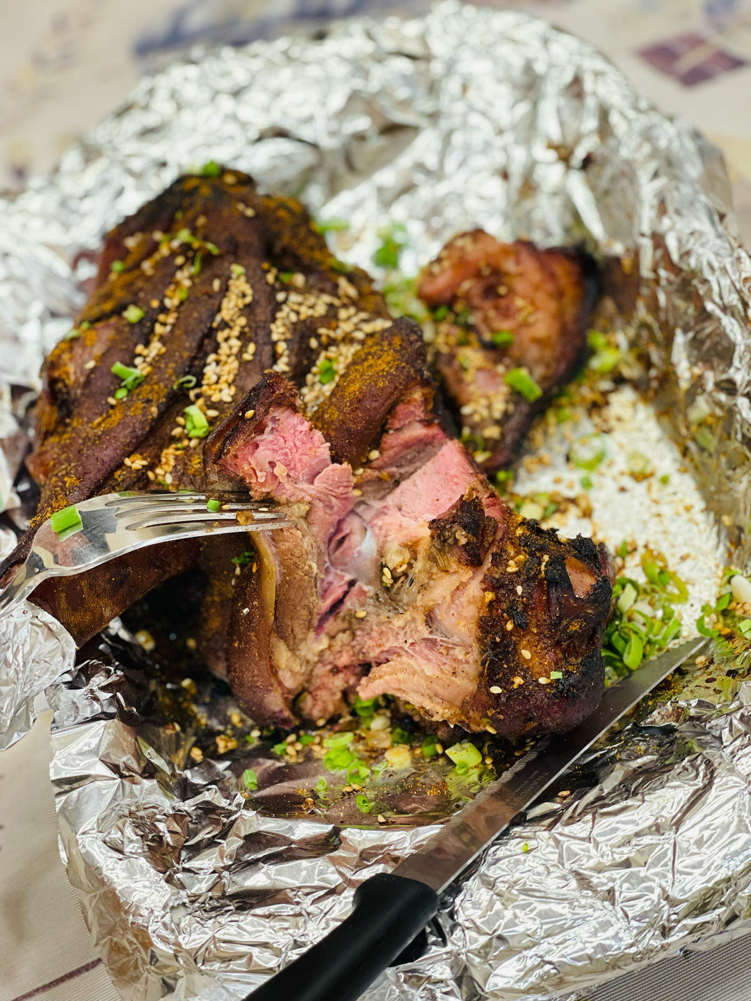 90分钟后取出,揭开锡纸,把汤汁装进碗里,没没皮的那一面朝上,刷上汤汁,撒上孜然、花椒粉、辣椒粉,370华氏度烤20分钟
