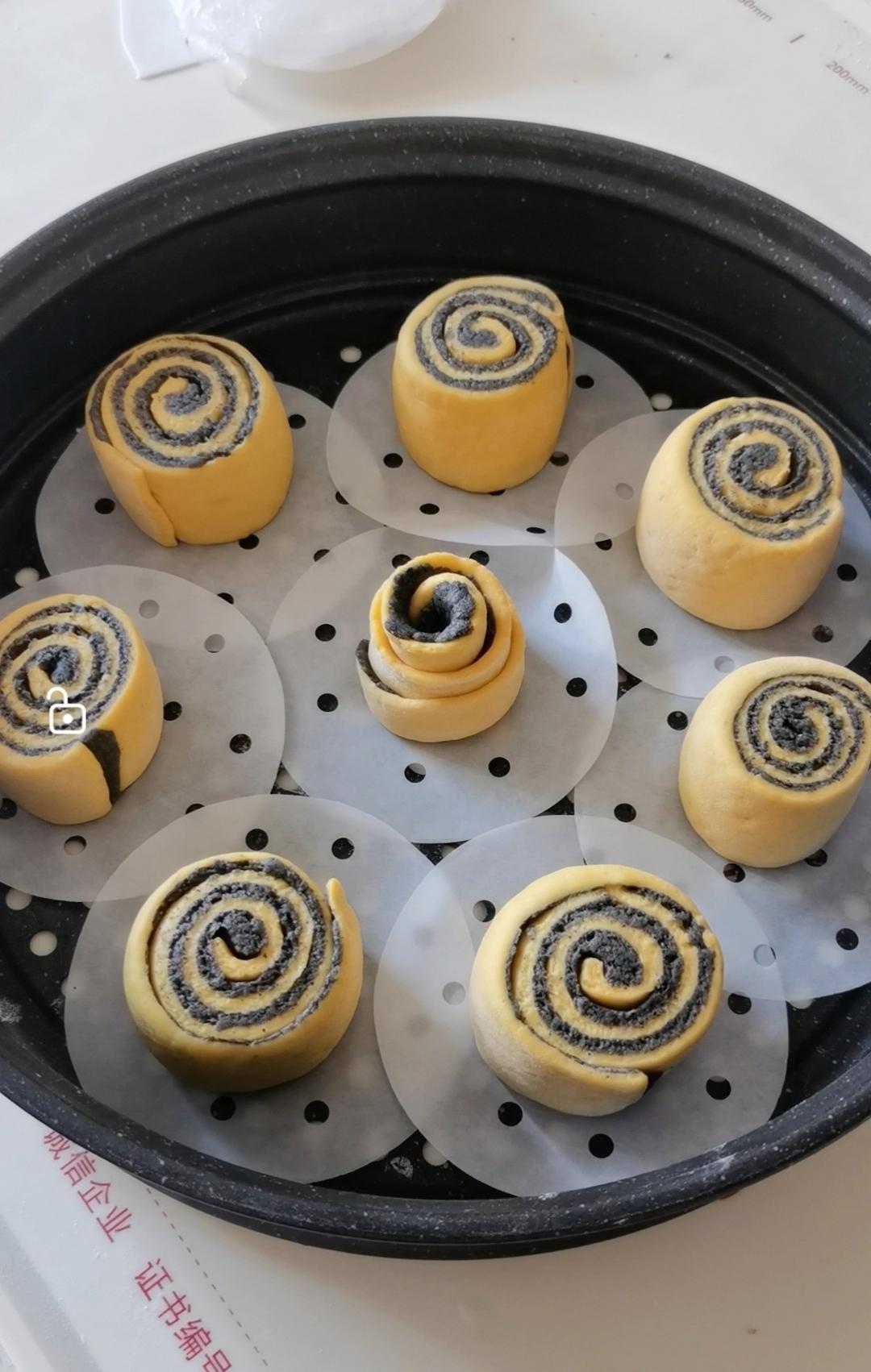 第二块面团切好后,花纹朝上,整理成圆形,进行发酵 发酵后,水开上汽计时,蒸15分钟再焖3分钟