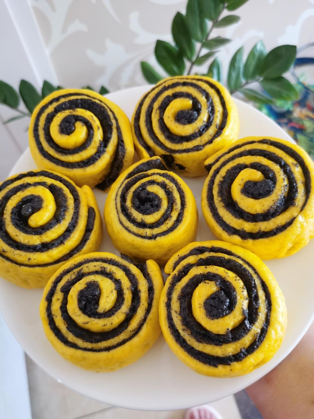 南瓜面团和黑芝麻面团各混合,揉成光滑面团
